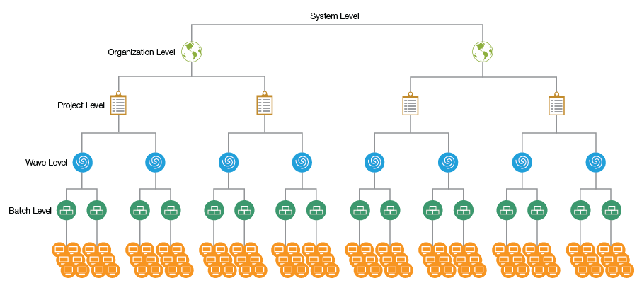 Roles can be assigned directly or inherited. Inherited roles can be set for system users or groups at the System, Organization, Project, Wave, or Batch level. Inherited Dashboard User role can be set for organization users or groups at the Organization, Project, Wave, or Batch level. The inherited roles apply across all components in that level for existing and new components, as illustrated in Figure 8-1. For example, if you assign the system user account for John as the Project Manager at the organization level, the organization’s existing and new projects automatically inherit the setting.