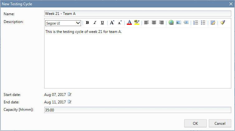 7. In hh:mm format, enter the amount of time that you want to provide for this testing cycle (Capacity), in our case, we entered 35:00.