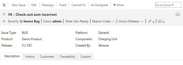 | History | Tracks all changes concerning the issue. For example: When the issue was created, who created it, actions like reassigning, fixing, verifying, addition of customers, files, testcases, and so on. |