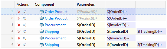 Silk Central 自动将第一个业务组件的 OrderID 输出参数映射到后续业务组件的 OrderID 输入参数,因为这些参数具有相同的名称。