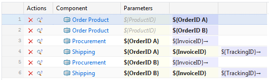 下图通过将后续两个 Order Product 业务组件的 OrderID 输出参数写入临时变量 OrderID A 和 OrderID B 显示了它的工作方式。