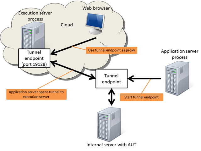 Silk Central Connect 基于 Silk Central 的体系结构。而且,它允许使用基于云的执行服务器。如果您在使用基于云的执行服务器的内部网上测试内部 Web 应用程序,则可以为本地内部网网站测试配置隧道设置。使用此设置,Silk Central 应用程序服务器将打开一个通往基于云的执行服务器的隧道,并作为代理允许在您的本地内部网中测试网站。请注意,此选项比直接连接速度慢,所以仅在需要时选择。