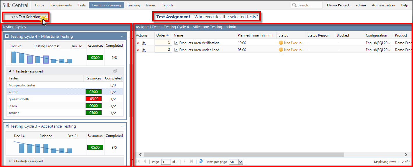 手动执行计划页面包含四个区域,它们显示在两个屏幕上。在第一个屏幕(即测试选择屏幕)上,您可以为测试周期选择和计划测试。在第二个屏幕(测试分配屏幕)上,您可以将所选测试周期的测试分配至将执行测试的测试人员。