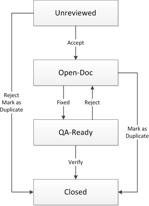 假设文档问题进入未审阅状态。此时,审阅者可采取三种操作。他可接受问题、拒绝问题或将其标记为另一个问题的副本。如果问题被拒绝或发现是重复的,则将关闭问题并附上原因代码已拒绝重复。如果审阅者将问题视为需要修复的文档问题,则会将问题移至开放文档状态和文档部收件箱。此时,文档专家可采取以下两种操作之一:采取已修复操作或标记为重复操作。
