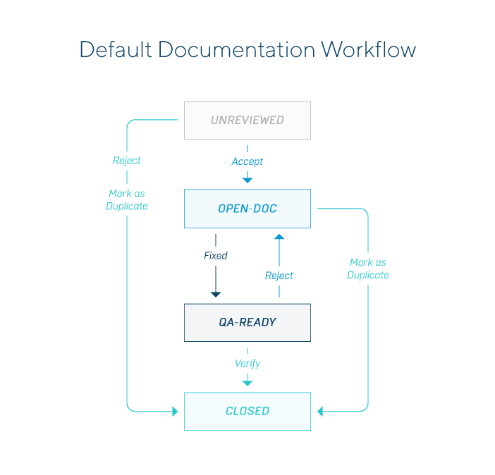 Angenommen, ein Dokumentationsfehler tritt im Status Ungeprüft in den Workflow ein. An diesem Punkt kann der Prüfer eine von drei möglichen Aktionen durchführen. Er kann den Fehler akzeptieren, ablehnen oder als Duplikat eines anderen Fehlers kennzeichnen. Wird der Fehler abgelehnt oder als Duplikat gekennzeichnet, wird er mit der Begründung Abgelehnt oder Doppelt geschlossen. Hält der Prüfer den Fehler für einen Dokumentationsfehler, der behoben werden muss, erhält der Fehler den Status Zu dokumentieren und landet im Dokumentationspostfach. Der Dokumentationsverantwortliche kann an dieser Stelle zwei Aktionen durchführen: Behoben oder Doppelt eingetragen.