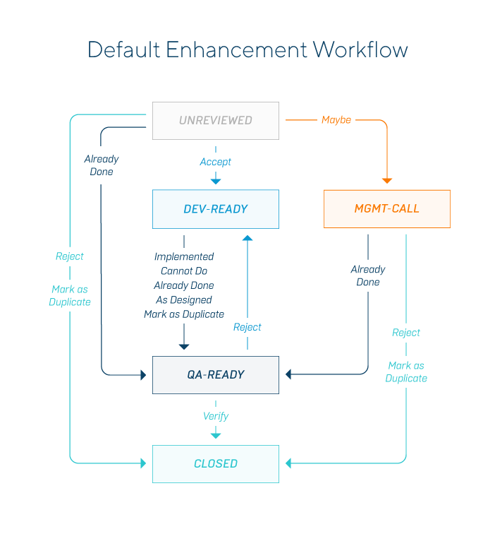 初期レビュー担当者または管理チームが機能拡張要求を却下すると、問題は [却下] の理由コードで完了します。この [却下] アクションは、[QA 準備完了] 状態の問題に対して実施される [却下] アクションとは異なります。この場合は、開発アクション ([実装済み][実現不能][対応済み]、または [重複として指定]) が議論されます。