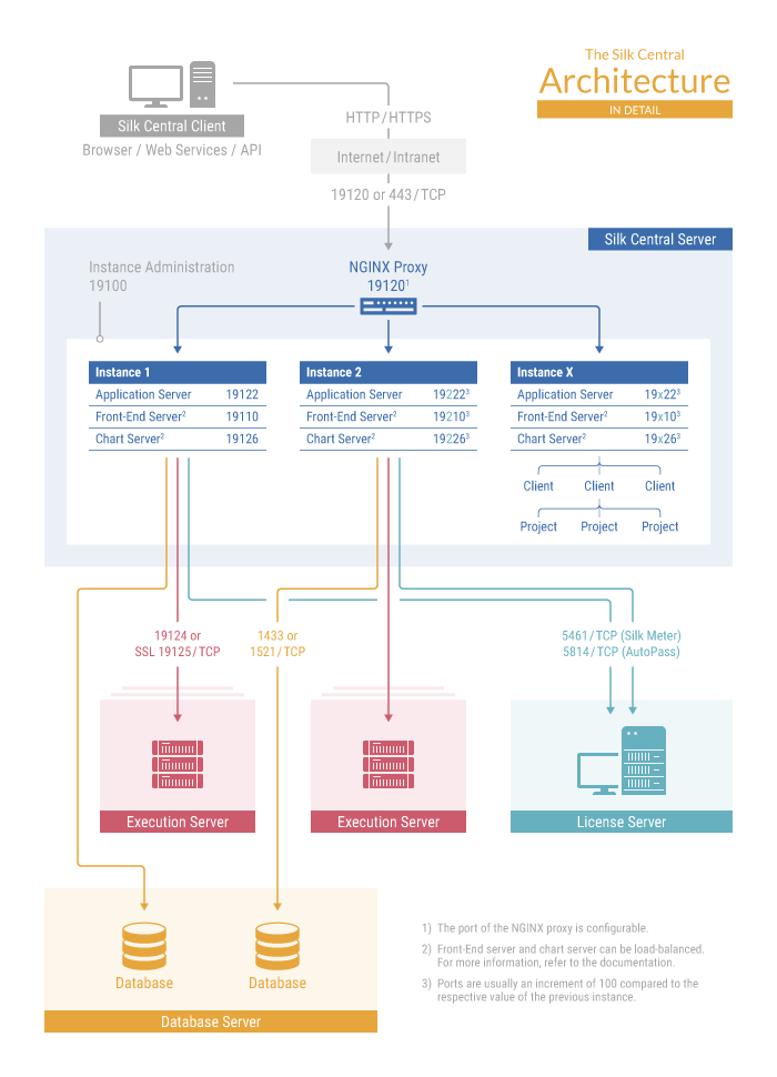 NGINX プロキシ サービスは Silk Central サーバー上にインストールされ、さまざまなインスタンスへのアクセスを制御します。各インスタンスのサービスは、専用のポートで実行していますが、セキュリティと柔軟性向上のため、http://<Silk Central サーバー>:19120/<インスタンス名> 形式のアクセスを、プロキシがインスタンス名から実際の URL にルーティングします。