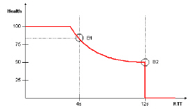 Based on the health function shown above, the first boundary (B1) is considered to be the ideal value. Deviations from this ideal are not critical, but they are reflected in health values. This is particularly important when there is a pattern of performance degradation. The emphasis of these deviations is supported by the exponential behavior of the function. The second boundary (B2) marks severe behavior, and so the health rating drops to zero.