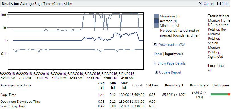 For example, to see a detailed analysis of the overall page time, click Average Page Time (under the Page Times node) . This takes you to a performance Details chart.