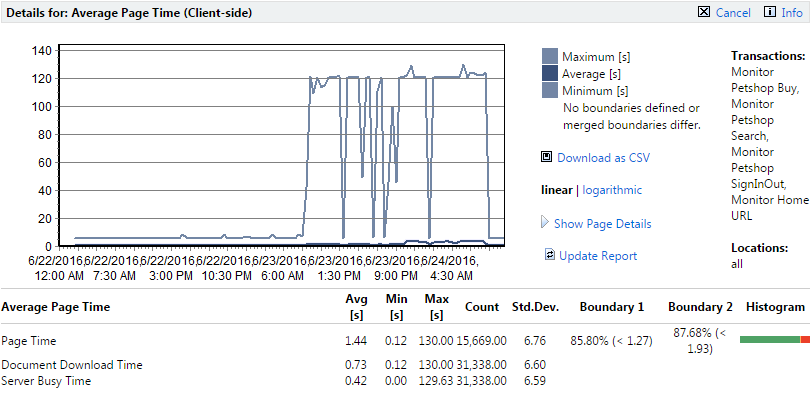 Page Time (dark blue), Document Download Time (light blue), and Server Busy Time (medium blue) are color-coded and graphed separately. Boundary 1 is color-coded yellow. Boundary 2 is color-coded red.