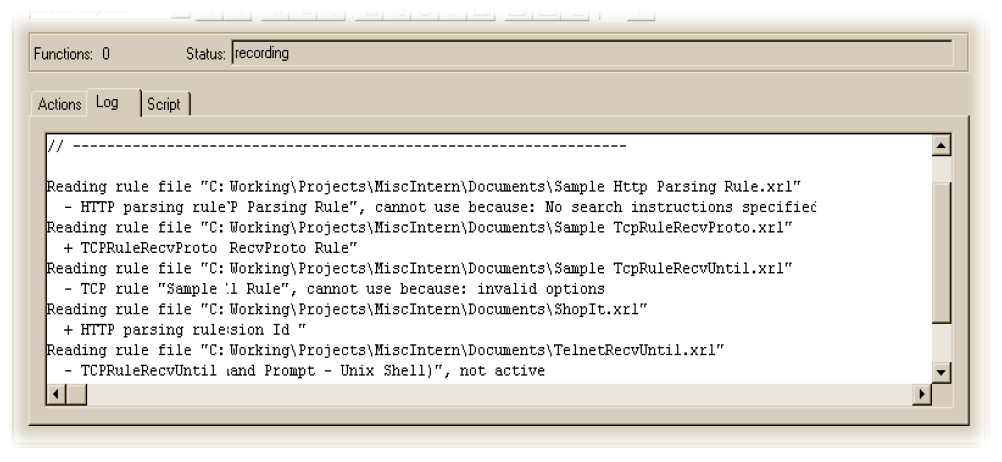 This section offers some recommendations for troubleshooting recording rules that do not operate as expected. The Recorder outputs diagnostic information to the Log tab window, as shown in the screenshot below.
