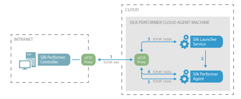 1. Controller opens initial connection to Silk Launcher Service through an HTTP Proxy and port 443. Silk Performer automatically uses the default port number of 443 for a secure connection. Connection goes through an additional HTTP proxy if company policy requires it.