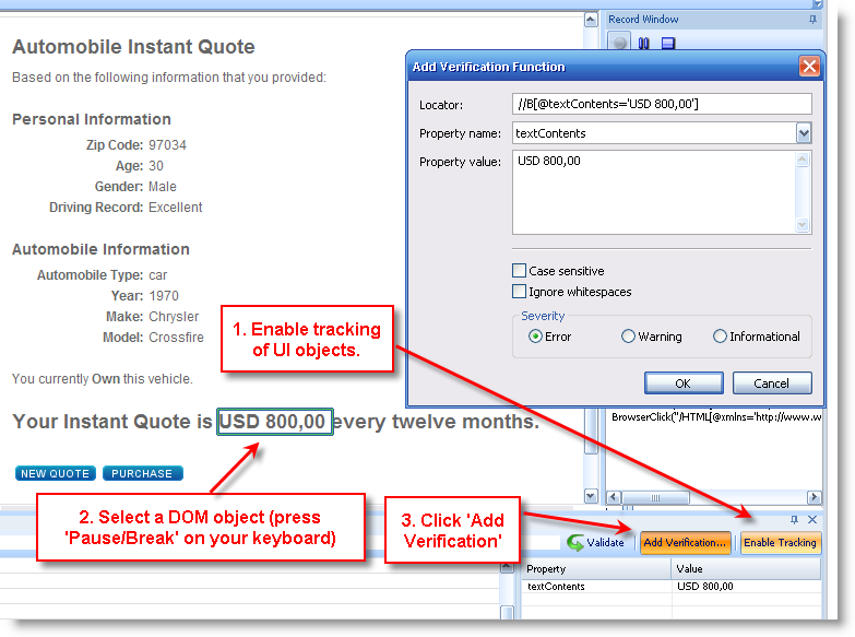 1. During browser-driven script recording using the Browser Application, select a DOM object that contains a value you want to later verify during script replay (press Pause/Break on your keyboard to select a DOM object).