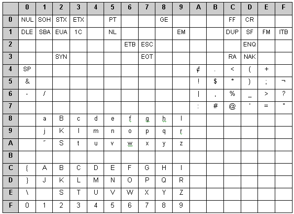 The table below is the standard EBCDIC table for the 2780/3780 Protocol code map (taken from [EBCDIC_CTI]). As an example, to decode the EBCDIC byte 0x83, choose row 8 and column 3. You'll find that 0x83 maps to the letter c in ASCII.