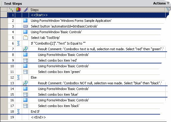 判断ロジックによって、ComboBox コントロールの Text プロパティの内容が評価されます。コントロールに値が設定されていない場合、Text プロパティは Nothing または空白です。値が Nothing または空白の場合は、ビジュアル テストはある一連のステップを実行し、値が Nothing または空白以外の場合は、異なる一連のステップを実行します。